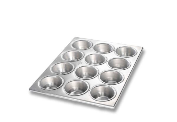 This 12-mould aluminum cupcake pan features square corners and a reinforced wire in rim for added strength.